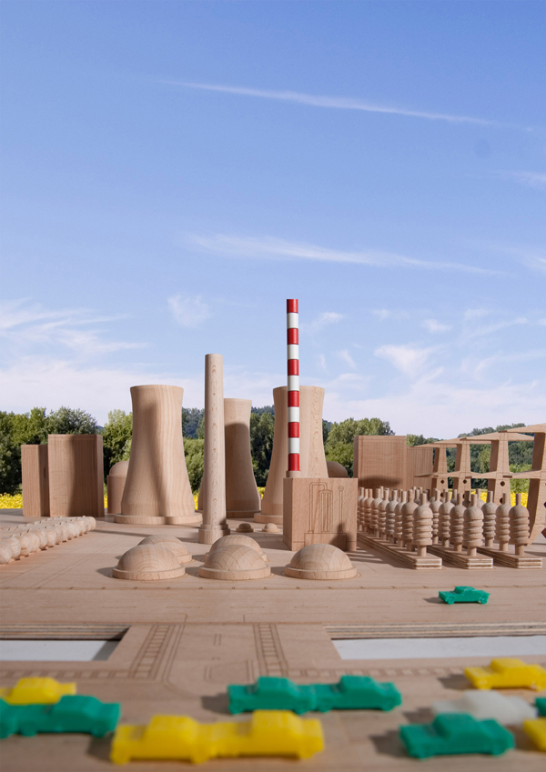 Model of a nuclear power plant made in wood. Cars can see